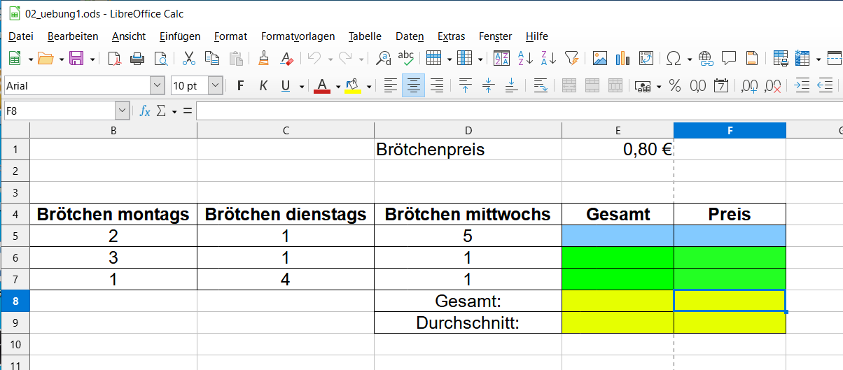 Erstelle die Datei 02_uebung1 und speichere sie in deinem Verzeichnis! (Siehe Abbildung!) Berechne Peters Brötchenanzahl und den Preis, den er bezahlen muss (blaue Zellen)!