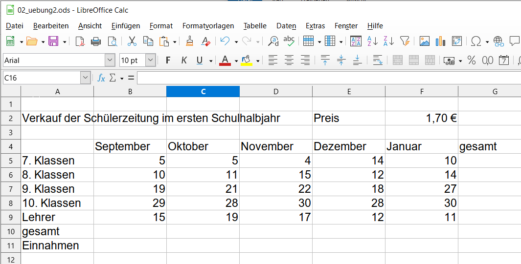 Gib die folgende Tabelle (siehe Abbildung!) in ein Tabellendokument ein und speichere es unter den Namen 02_uebung2 ab! Berechne die Zellen G5 bis G9, B10 bis G10 und B11 bis G11! Welche Unterschiede stellst du bei der Eingabe von Text und Zahlen hinsichtlich der Anordnung fest?