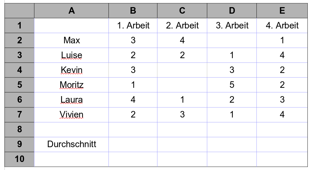 =MITTELWERT(B2:B7)ein, und kopiere die Formel in die Zellen C9, D9 und E9. Was stellst du fest?