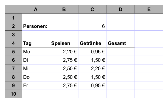 In der Tabelle oben werden die verzehrten Speisen und Getränke der 5 Angestellten eines Lokals erfasst. In die Zelle D5 wird die Formel